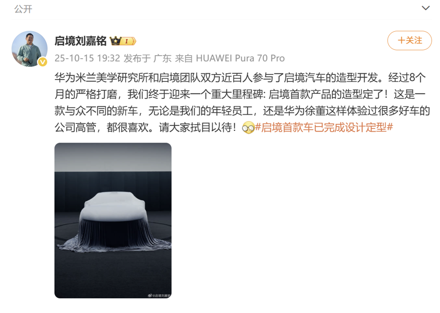 10月16日,启境汽车CEO@启境刘嘉铭在微博上宣布,经过长达8个月的精心打磨与设计评审,由广汽集团与华为联合打造的高端智能新能源汽车品牌——启境旗下首款车型完成了设计定型。这款新车不仅凝聚了双方近百名设计师的心血,还特别融入了华为米兰美学研究所的国际化美学理念,为年轻消费者量身定制了一款兼具现代感与实用性的高端智能车。