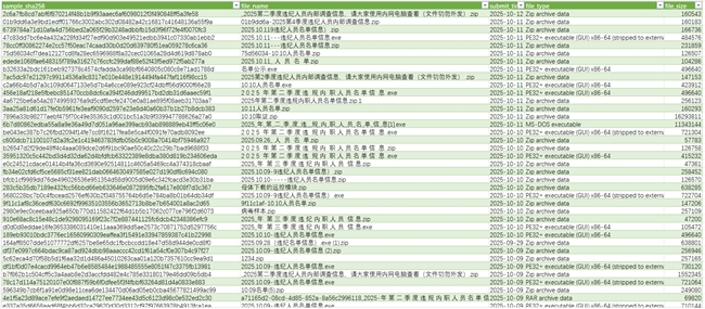 在微信、企业微信、钉钉、飞书等办公IM软件中,骗子以“2025第二季度违纪人员内部调查信息”“机构编制违规处理通知”为诱饵,附上带恶意链接的压缩包或EXE文件,文件名明确标注“内网查看”“切勿外传”,伪装成企业内部涉密文档,降低用户戒备心。从8月4日开始投递至今,此类样本已覆盖zip、PE等多种格式,仅9月22日单周就捕获80个样本,为近期高峰。